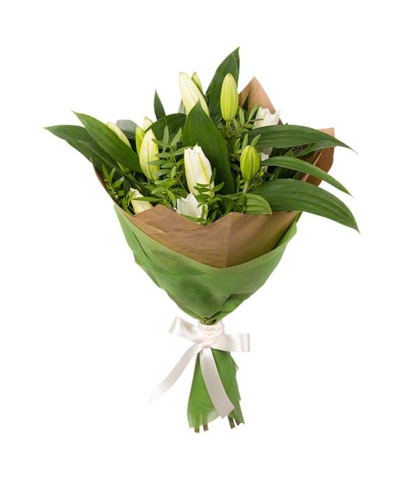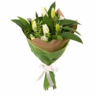 Букет выполнен в стиле минимализма, здесь гармонируют белый и зеленый цвета. Основной цветок – лилии, показывающие утонченность, невинность и чистоту. Нежный букет подойдет каждому, независимо от пола. Цветы отлично подойдут для свидания, будьте уверены, что человек оценит этот приятный жест. Друзья придут в восторг, получив столь изысканный подарок.