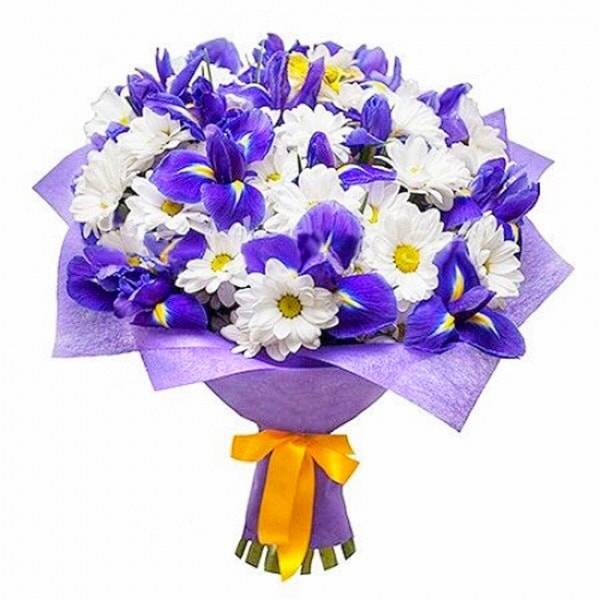Весенний букет из нежных ирисов и белой ромашковой хризантемы подходит к любому праздничному мероприятию. Его можно преподнести на 8-Марта, годовщину, день рождения или день всех влюбленных.